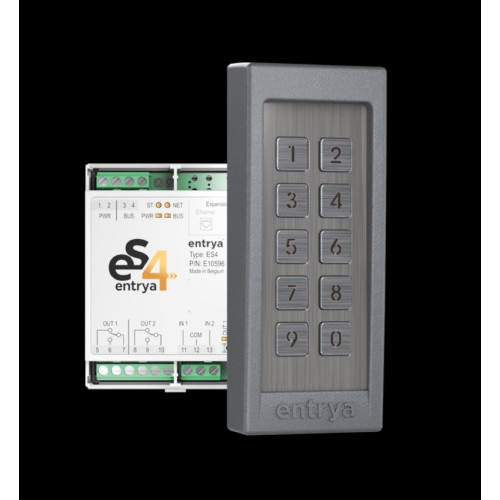 EntraSYSTEM4 kit: ES4-controller en codeklavier KP-ES4 met verlicht en verwarmd toetsenbord (RVS 316). Aansluiting via 2-draads bus tot 100 m. Externe ES4-controller met 2 relais.